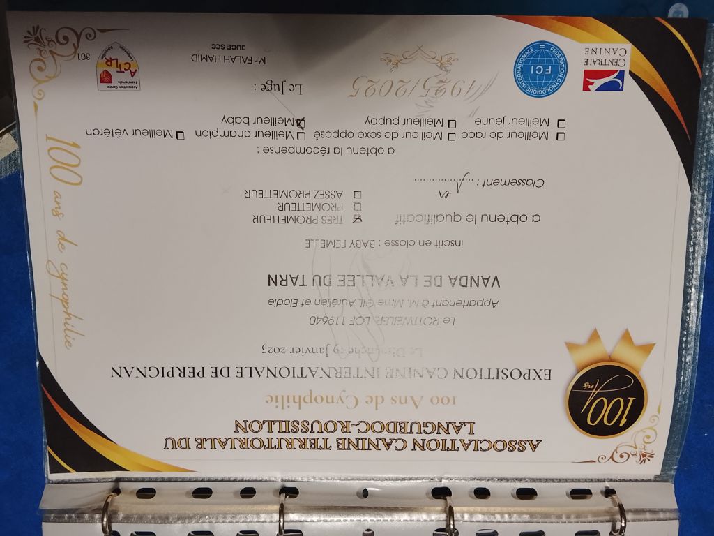 Résultats d'expositions 2025 2024 2023 2022 1er très prometteur Meilleur Baby Vanda De La Vallée Du Tarn 19/1/2025 - Perpignan Exposition internationale Juge : Mr Falah Hamid